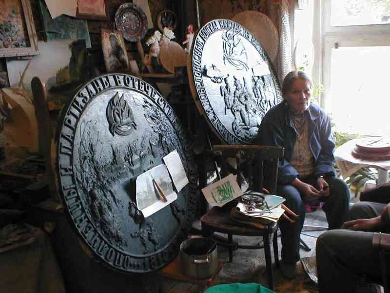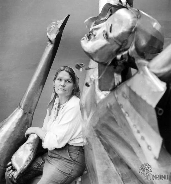 Гипсовый рельеф – мать, прижимающая к груди младенца. Белый, легкий и, кажется, светящийся нежностью. Триптих-алтарь из бронзы, развивающий тему чуда рождения жизни, ее хрупкости и незащищенности. Малыш, сонный, свернулся калачиком. Толстоногая молодая женщина спокойно стоит, закинув руки за голову. Она же сидит, отдыхая после бани, — «Душа теста». Так обильна и щедра ее плоть. Винтом закручена женская фигура в танце, руки сплетены над головой (белый камень). Гордая некрасивая женская голова в резком повороте на выгнутой лебединой шее (керамика, обжиг, поливы). Неуклюжие в своих комбинезонах, как воробьи на своих жердочках, примостились сварщицы на металлических конструкциях (алюминий, литье).